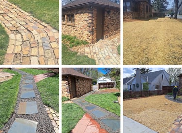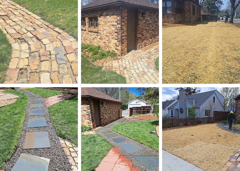 Full lawn removal and regrading, soil installation, seeding and fertilization, drain tile installation, and custom walkway construction using heavy-duty pavers.