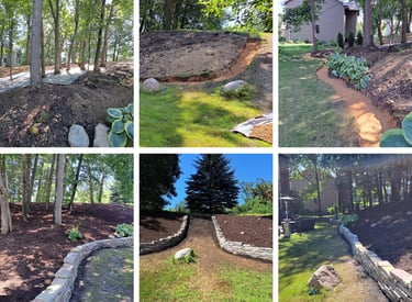 Custom design and installation of a stone retaining wall and access pathway, full site cleanup, shrub removal, and weed control system.